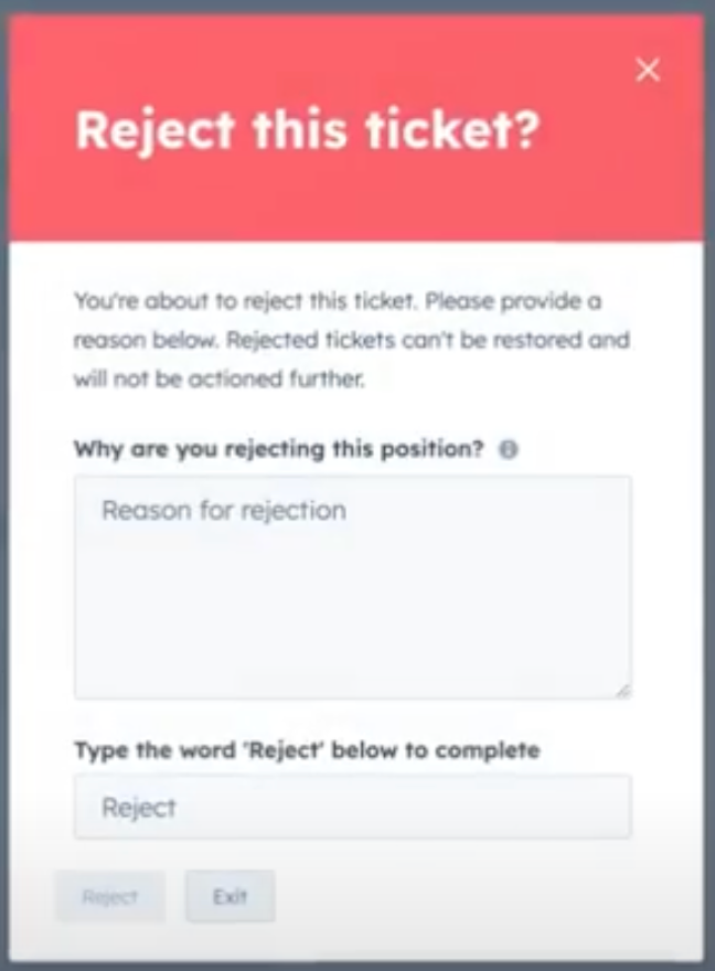 Enter the reason for the rejection and type the word ‘Reject’ in the text boxes that appear. Click Reject, and the ticket status will update to Rejected.