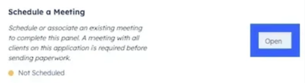 - To do this, simply select the "Open" button on the "Schedule a Meeting" Panel on the other New Application Ticket.