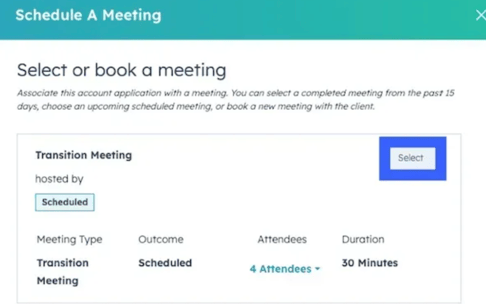 - Then, click on the "Select" button on the existing meeting you would like to associate the other New Account Application with.